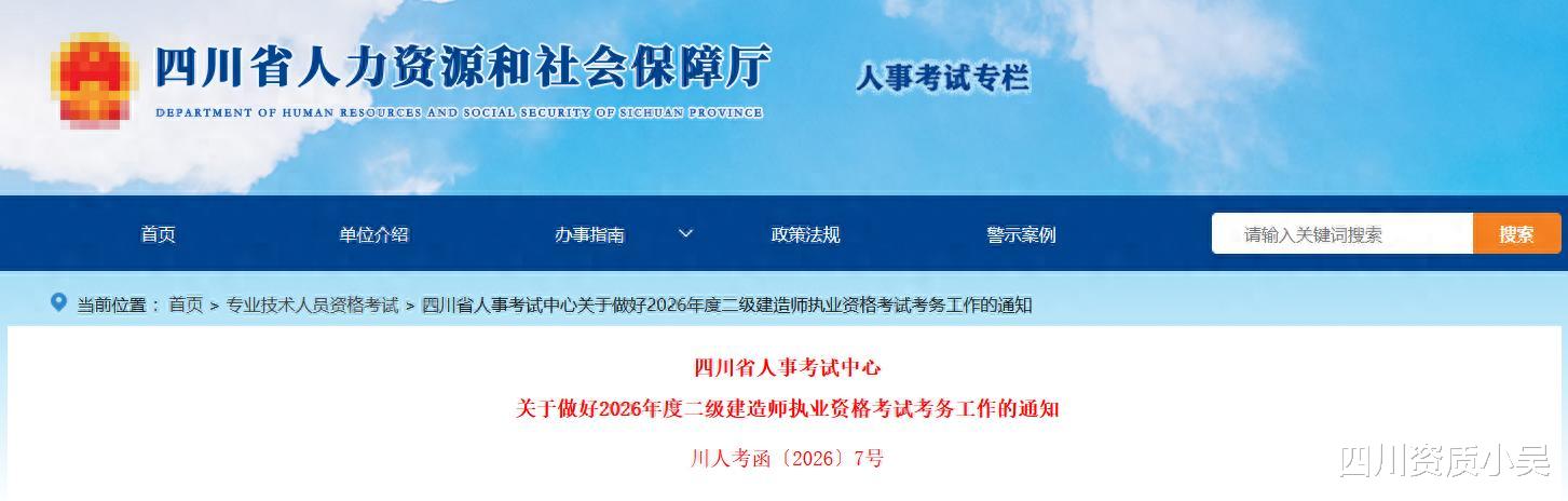 四川省人事考试中心昨日发布通知,《关于做好2026年度二级建造师执业资格考试考务工作的通知》川人考函〔2026〕7号。