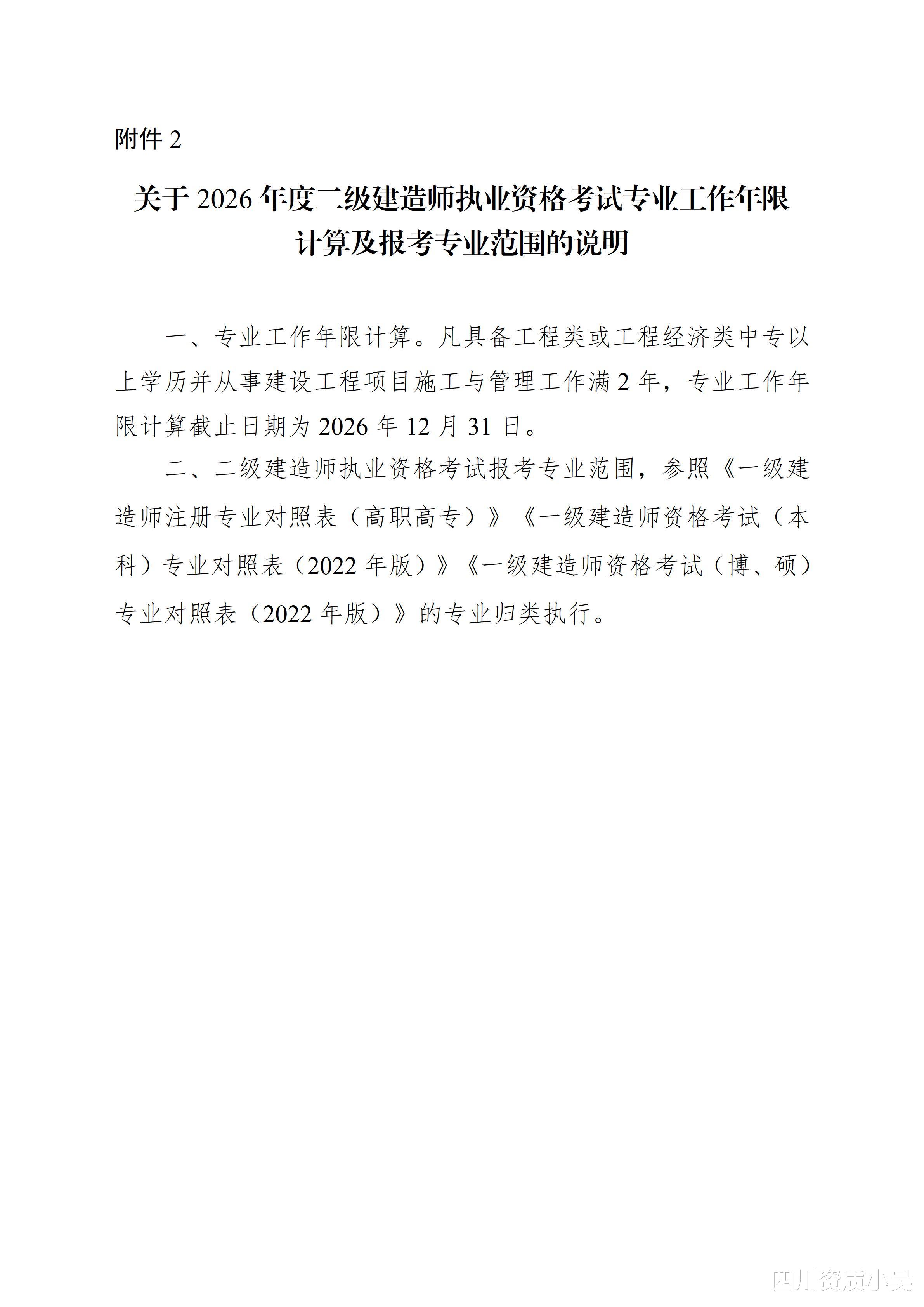 关于2026年度二级建造师执业资格考试专业工作年限计算及报考专业范围的说明见附件2。
