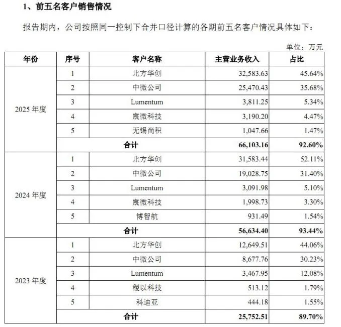 与此同时,托伦斯客户依赖明显,2023年至2025年,公司近90%营业收入高度依赖前五大客户。其中,第一大客户北方华创为公司营收贡献了“半壁江山”,报告期内(2023年至2025年,下同)公司对北方华创的销售收入占主营业务收入的比例分别为44.06%、52.11%、45.64%。