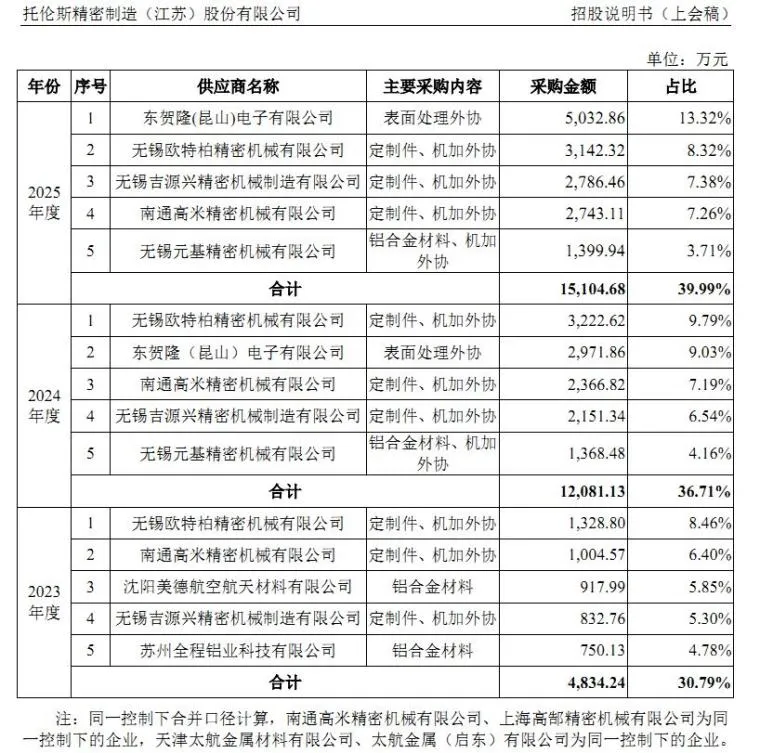 此次IPO,托伦斯关联交易的情况也备受关注。据了解,南通高米精密机械有限公司(以下简称“南通高米”)、上海高郜精密机械有限公司(以下简称“上海高郜”)是托伦斯的重要外协加工供应商,且两家供应商均系董事长堂姐钱某娟控制的企业。数据显示,2022年至2025年6月末,托伦斯向关联供应商南通高米采购金额分别为0.44万元、1004.36万元、2366.82万元和1796.70万元,采购规模呈现出逐年递增的态势;2022年至2023年,公司向上海高郜采购金额分别为887.45万元、0.21万元,2023年后未再向上海高郜采购。