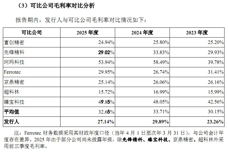 毛利率的持续波动与行业差距,也是导致托伦斯“增收不增利”的原因之一。2023年至2025年,托伦斯综合毛利率分别为23.26%、29.89%和27.14%,2025年综合毛利率与上一年度相比下降2.75个百分点;与此同时,托伦斯的同业可比公司同期平均毛利率分别为30.15%、33.71%和32.65%,公司毛利率低于行业均值。