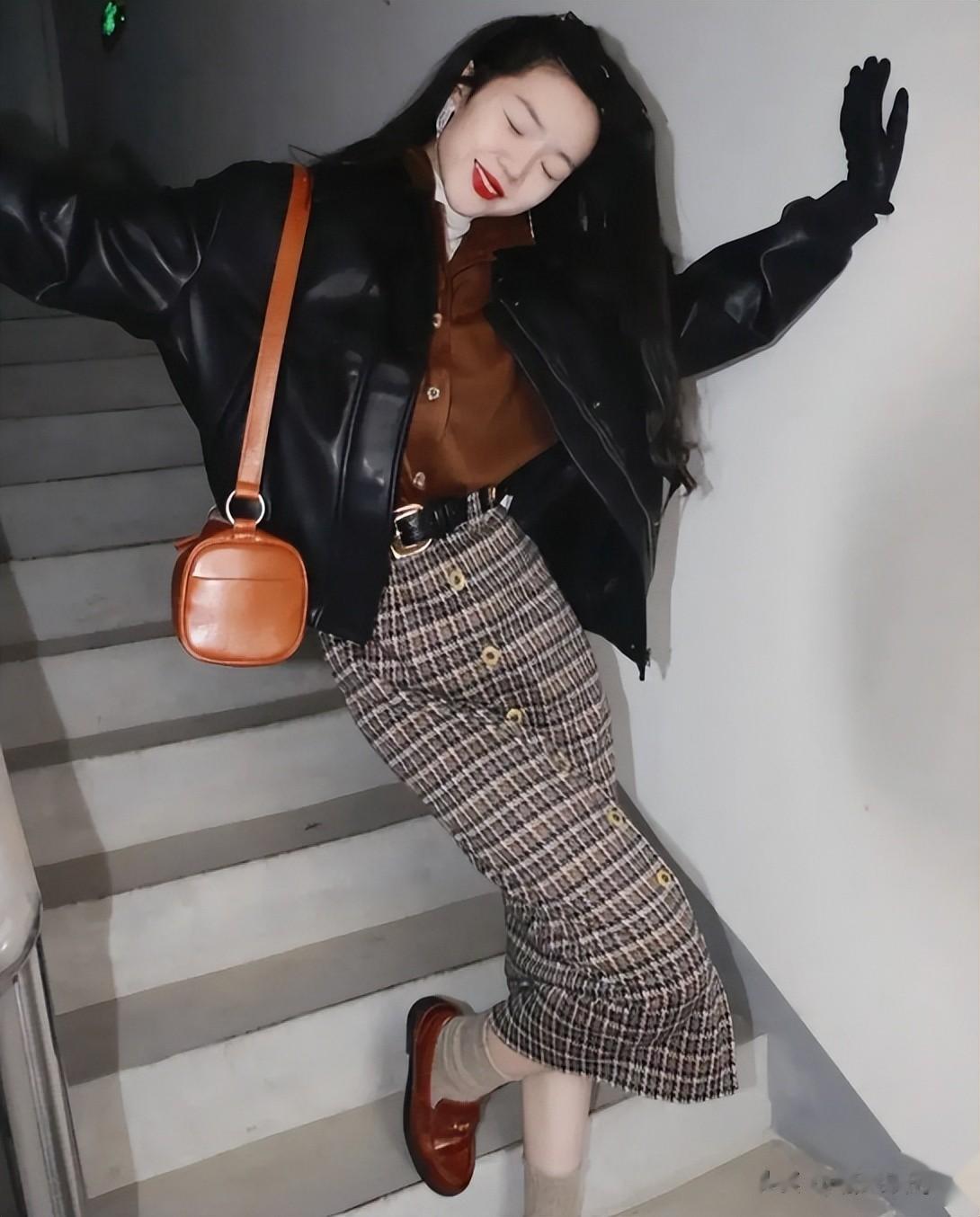看到身高172cm关晓彤,身穿棕色皮衣+灰色半身裙,给我们穿搭提供了不错的灵感。棕色温暖复古,灰色优雅知性,两种颜色碰撞出不一样的火花。