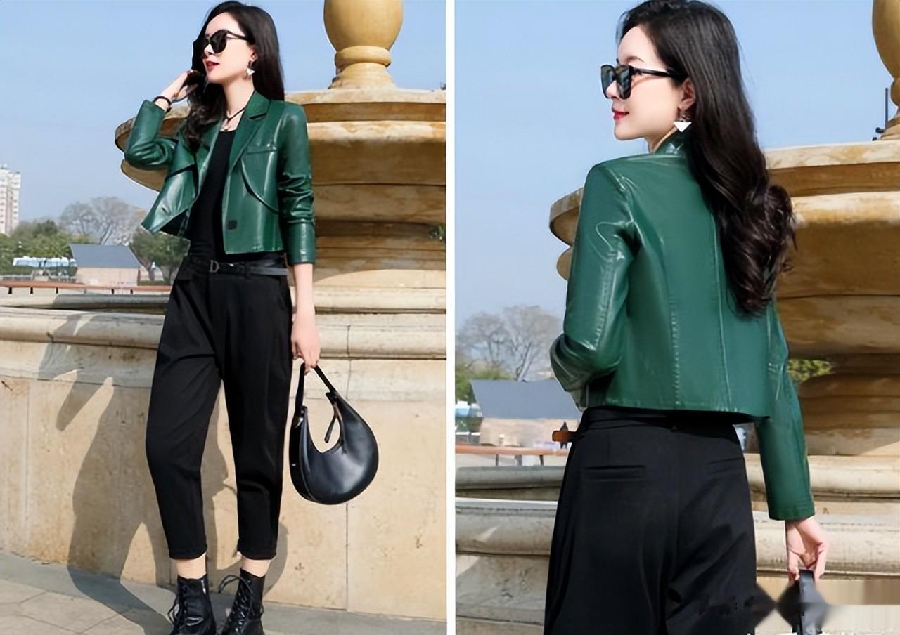 墨绿色短款小皮衣配黑色吊带配黑色束腿裤,个性十足的街头look。墨绿色独特有型,短款设计显高显瘦,黑色吊带增添性感元素,束腿裤舒适休闲。这种搭配既有个性又不失实用性,适合喜欢街头风的女生。墨绿色比经典黑更有看点。