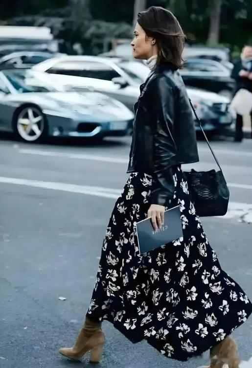 黑色皮衣配印花或波点风连衣裙,优雅与帅气的完美结合。黑色皮衣硬朗有型,印花连衣裙浪漫优雅,波点元素经典复古。这种搭配既不会过于张扬,又很有女人味。特别适合参加聚会或者正式场合,既优雅又不失个性。
