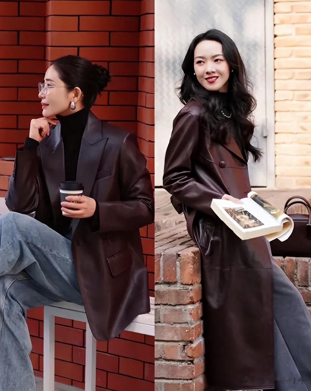 酒红色长款皮衣配牛仔裤,休闲与帅气的完美结合。酒红色温暖复古,长款设计优雅大气,牛仔裤经典百搭。这种搭配既舒适又不失时髦感,适合日常出行。长款皮衣比短款更加优雅,但也更考验身高,建议小个子女生选择收腰款式或者搭配高跟鞋。