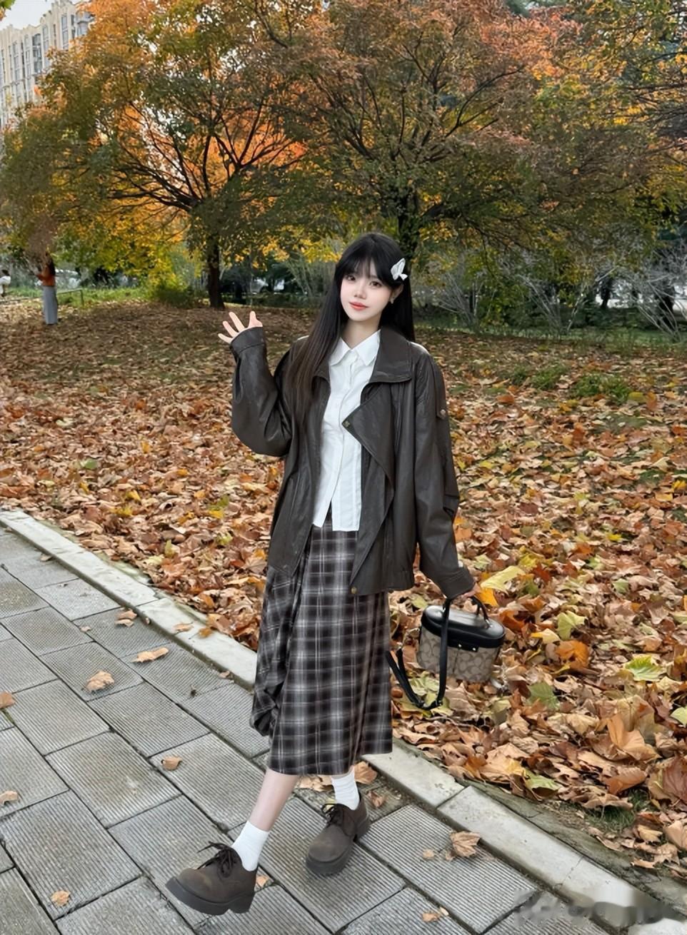 棕灰色皮衣配白色衬衫配棕色格子裙,学院风满满的青春look。棕灰色温柔耐看,白色衬衫清新纯净,棕色格子裙文艺复古。这种搭配减龄效果显著,特别适合学生党或者喜欢学院风穿搭的女生。整体搭配既正式又不失青春活力。