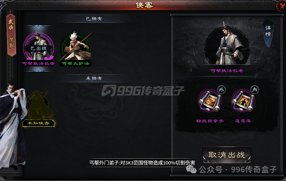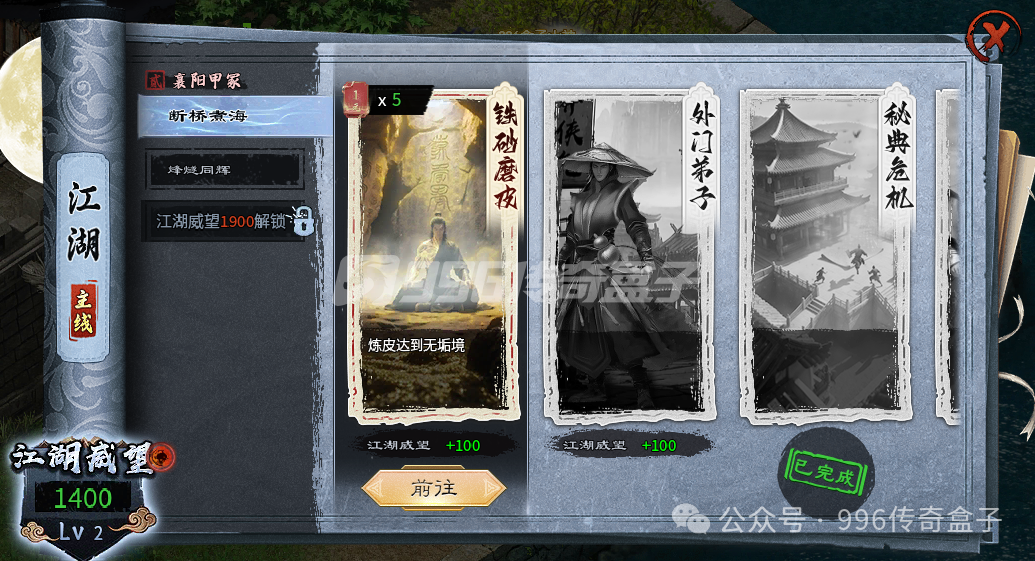 二大陆会有侠客玩法,加入门派,完成主线任务,会获得侠客。每个侠客都有不一样的内外功法,可以跟随出战,修炼功法,辅佐人物成长发育。每个人只能带一个侠客,侠客也分品阶,等阶越高的侠客越强,武功技能也越高!