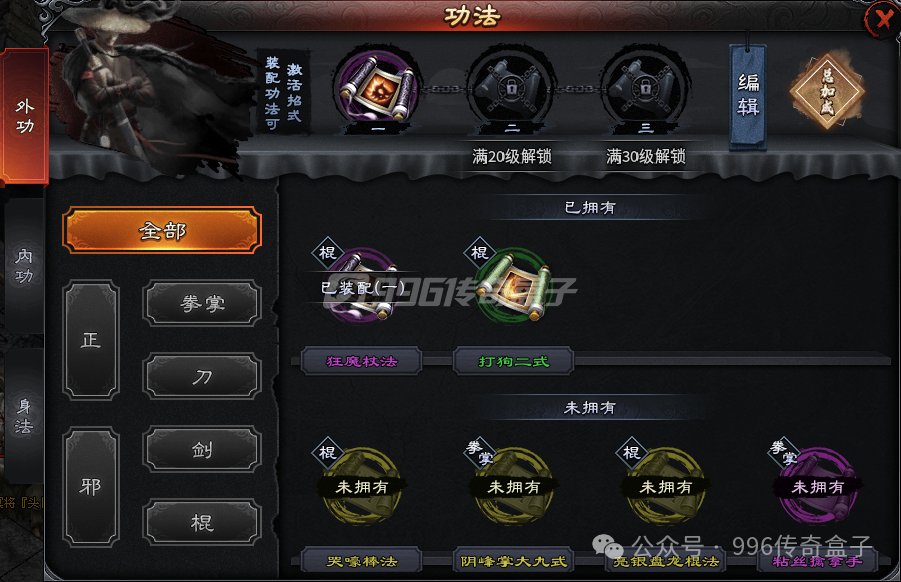 功法是这个服的重要玩法,有外功、内功和身法三种,外功最多,有十一个,内功和身法各三个。升级功法可以解锁独家技能,然后进行搭配,外功可以搭配三个,内功也是,身法只能装配一个。功法搭配比较自由,产生的效果也是很强的!