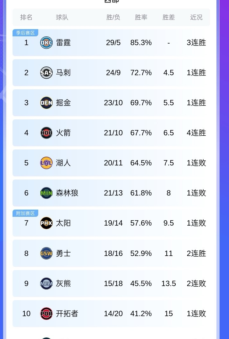目前在西部的排名,火箭来到西部第四,与湖人的胜场差来到1,与前方遭遇大量伤病侵袭的掘金的胜场差也只剩1。