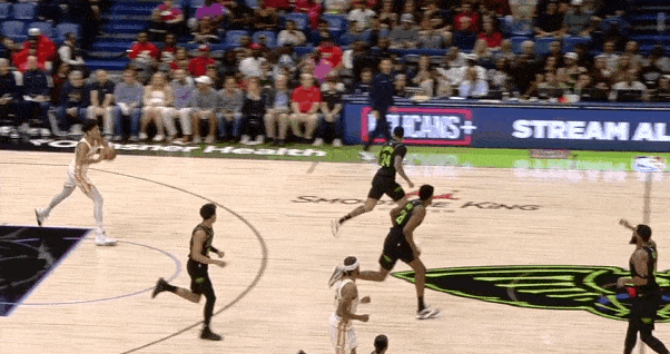 由于鹈鹕这套首发中没有绝对高度,且本场大量使用锋线错防铂金(主要对位人是皮维和贝),所以铂金本场有不少背身吃错位的得分入账。还是展现出了其作为兼具巨大体型、投射能力、背身惩罚错位能力的战略价值。