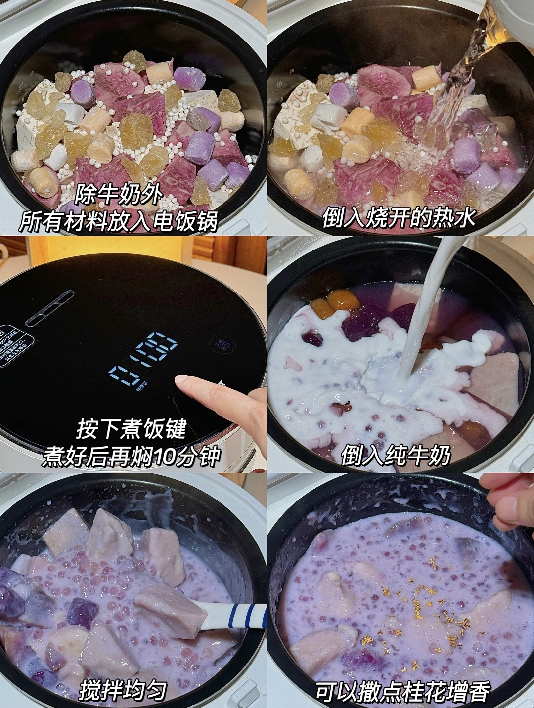 把芋头、紫薯、芋圆、西米、黄冰糖一股脑倒进电饭煲(别放牛奶!别放牛奶!别放牛奶!)。