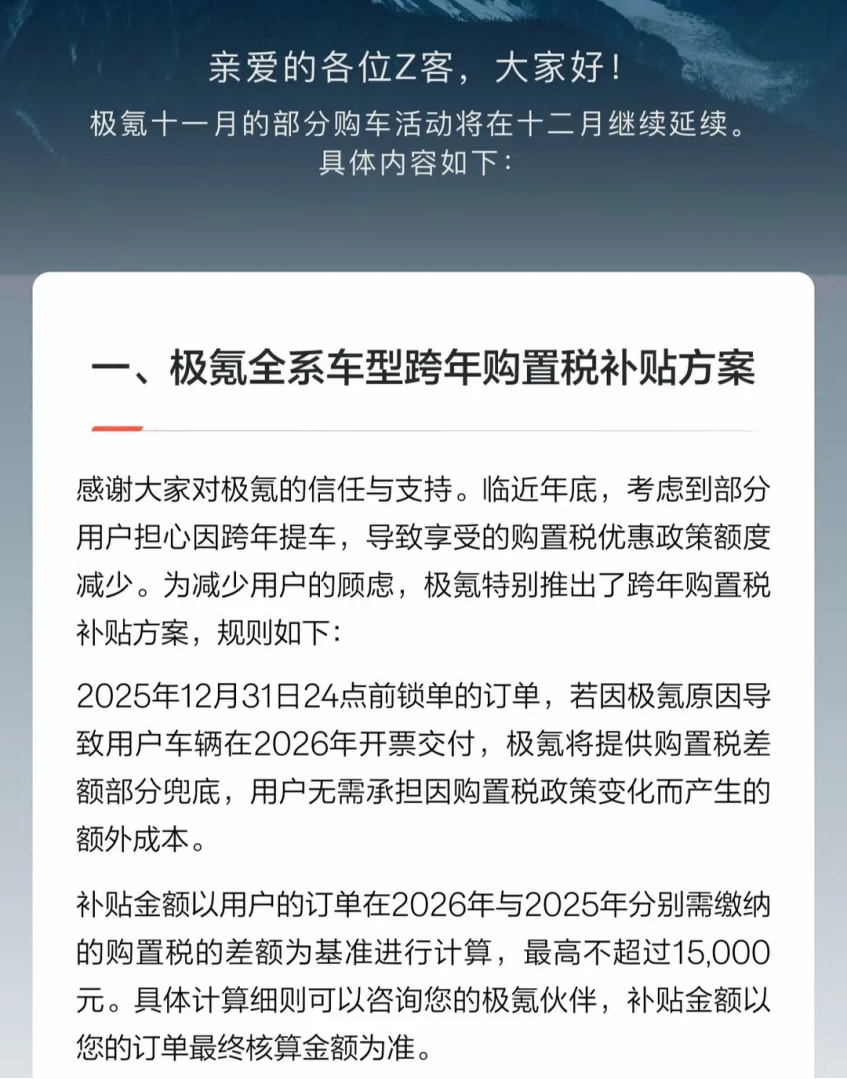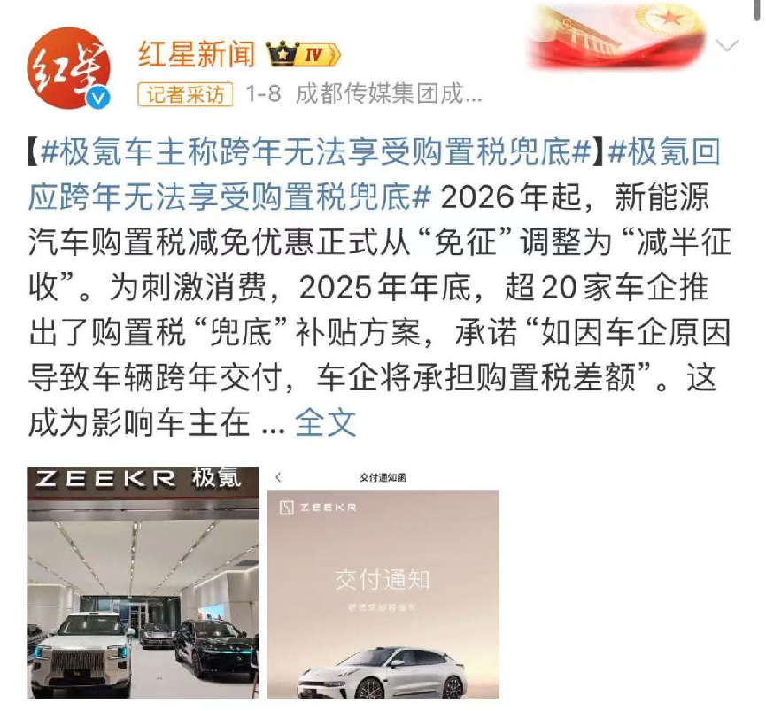 每到政策切换的节点,新能源汽车市场总会上演一波“末班车”抢购潮,随之而来的交付纠纷也成了行业高发问题。2025年末至2026年初,随着新能源汽车购置税从“全额免征”调整为“减半征收”,包括极氪在内的多家中国品牌纷纷推出购置税兜底政策,以缓解消费者对购车成本上升的担忧。虽然初心是好的,然而在执行兜底政策的过程中难免会引发一些误解,就像前段时间被热议的极氪,便是如此。
