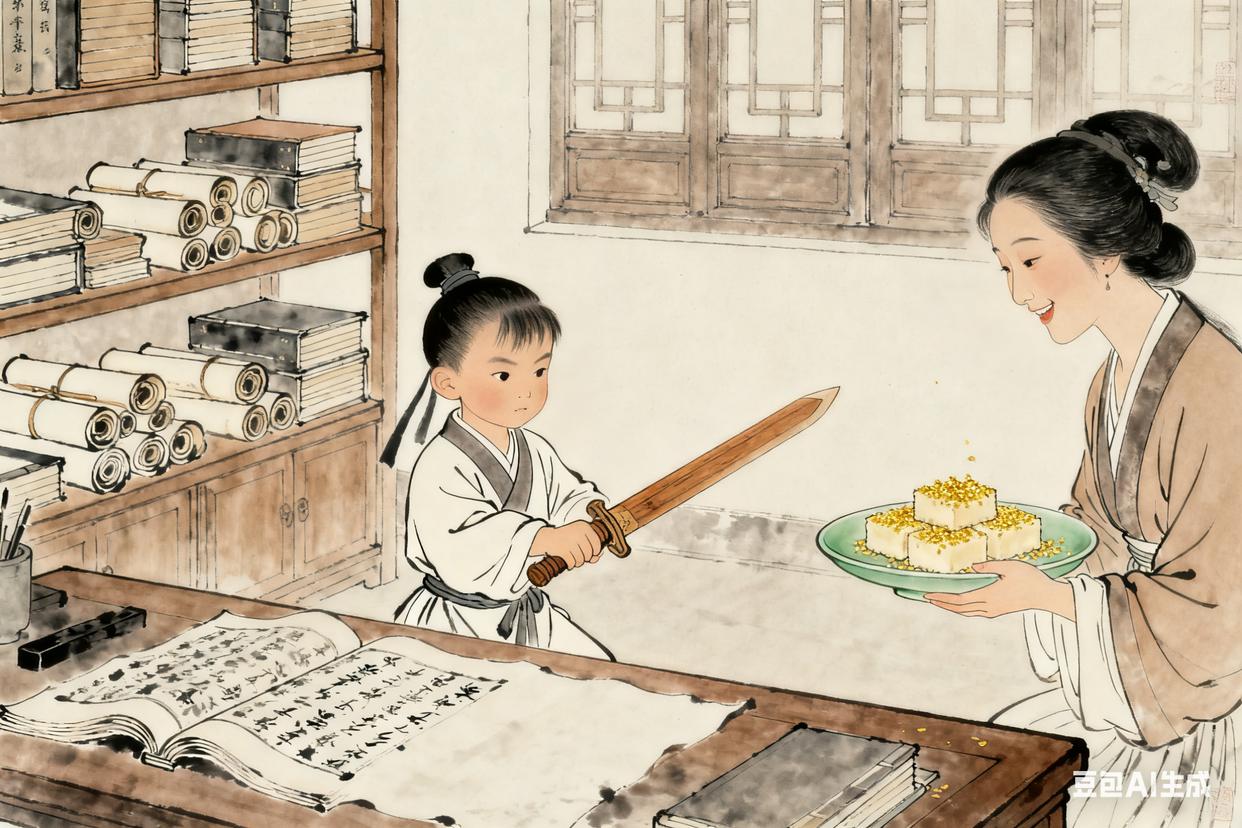 十岁那年,他在书房里翻《诸子百家》,书页被他翻得卷了边。母亲进来送点心,看见他把《庄子》摊在桌上,手里还拿着根木剑,在屋里比划。“又在疯闹?”母亲笑着拍他的背,他却举着木剑说:“我要像庄周一样,乘天地之正,而御六气之辩!”母亲没听懂,只把桂花糕放在他手边,那甜味,后来他在长安的宫里吃到蜜饯时,突然就想起来了——原来最甜的,还是小时候书房里的那一盘。