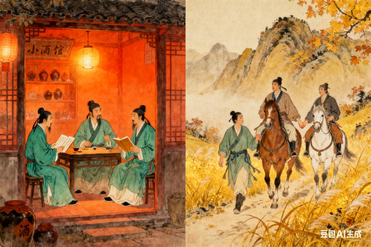 离开长安后,他在洛阳的街上,遇见了杜甫。那天杜甫穿着一件洗得发白的青布衫,手里拿着本诗集,正在看墙上的题诗。他走过去,拍了拍杜甫的肩:“这位兄台,也喜欢写诗?”杜甫回头,看见他,眼睛一下子亮了:“您是……李白先生?”那天他们在小酒馆里,喝了一下午的酒,从诗歌聊到人生,从长安聊到江湖。后来高适也来了,三个人一起去梁宋,白天骑马游山,晚上睡在一张床上,盖着同一条被子。杜甫后来写“醉眠秋共被,携手日同行”,他每次看到这句诗,都能想起那个秋天,梁宋的风,还有两个志同道合的朋友——原来最珍贵的,不是长安的荣华,是能跟你一起喝酒、一起聊诗的人。