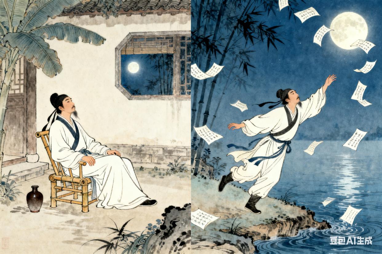 762年的秋夜,他坐在院子里,手里的酒壶空了。他看着月亮,突然站起来,踉踉跄跄地往江边走。李阳冰想拦他,却没拦住。他走到江边,看着水里的月亮,像一块银盘子。他笑了,伸手去捞,脚下一滑,就掉进了江里。江风很大,把他的诗稿吹得漫天飞,那些写满了江湖、写满了理想、写满了悲欢的诗,落在江面上,跟着月亮一起,漂向了远方。