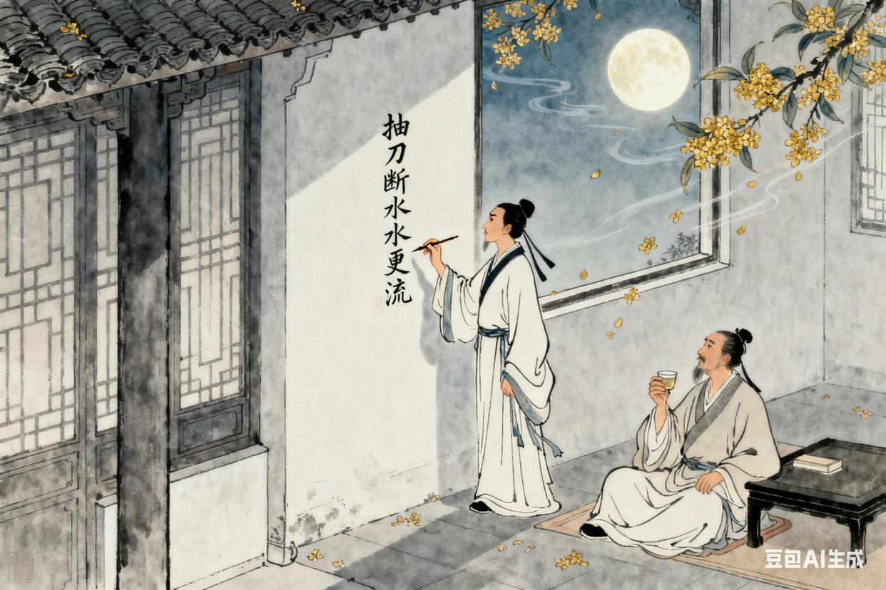 从梁宋回来后,他在开封住了一阵子,后来又去了齐鲁。他找道士给了自己一个道籍,正式成了道士。每天早上,他会去山上看日出,傍晚坐在河边看日落,兴致来了,就拿出笔,在纸上写几句诗。有一次,他在宣州的谢朓楼上,跟校书叔云喝酒。窗外的月亮很圆,风吹进来,带着桂花的香。他喝多了,拿起笔,在墙上写下“抽刀断水水更流,举杯消愁愁更愁”。校书叔云在旁边叹:“太白兄,你的诗,总是能写到人心里去。”他笑了笑,把笔扔在桌上:“不是我写得好,是这愁,这乐,都是真的。”那天晚上,他写了《将进酒》,写到“天生我材必有用,千金散尽还复来”时,他又想起了在扬州的夜市,想起了那些他帮助过的落魄公子——原来他的“材”,从来不是用来在宫里写艳词的,是用来写尽人间的真,人间的善,人间的美。