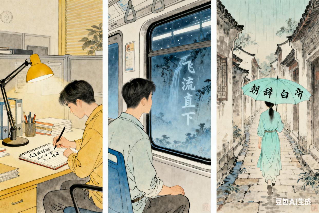 工位上的台灯下,有人在笔记本上写:“天生我材必有用”;地铁里的玻璃窗旁,有人看着窗外的夜景,想起“飞流直下三千尺”;江南的雨巷里,有人撑着伞,想起“朝辞白帝彩云间”。这些诗句,早就不是纸上的字了,是我们心里的光,是我们在难的时候,能咬着牙往前走的力量。