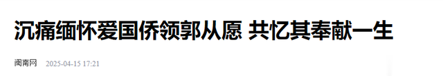 闽南网2025-04-15《沉痛缅怀爱国侨领郭从愿 共忆其奉献一生》