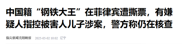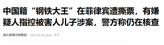 参考信息沈阳晚报2025-05-02《中国籍“钢铁大王”在菲律宾遭撕票,有嫌疑人指控被害人儿子涉案,警方称仍在核查》