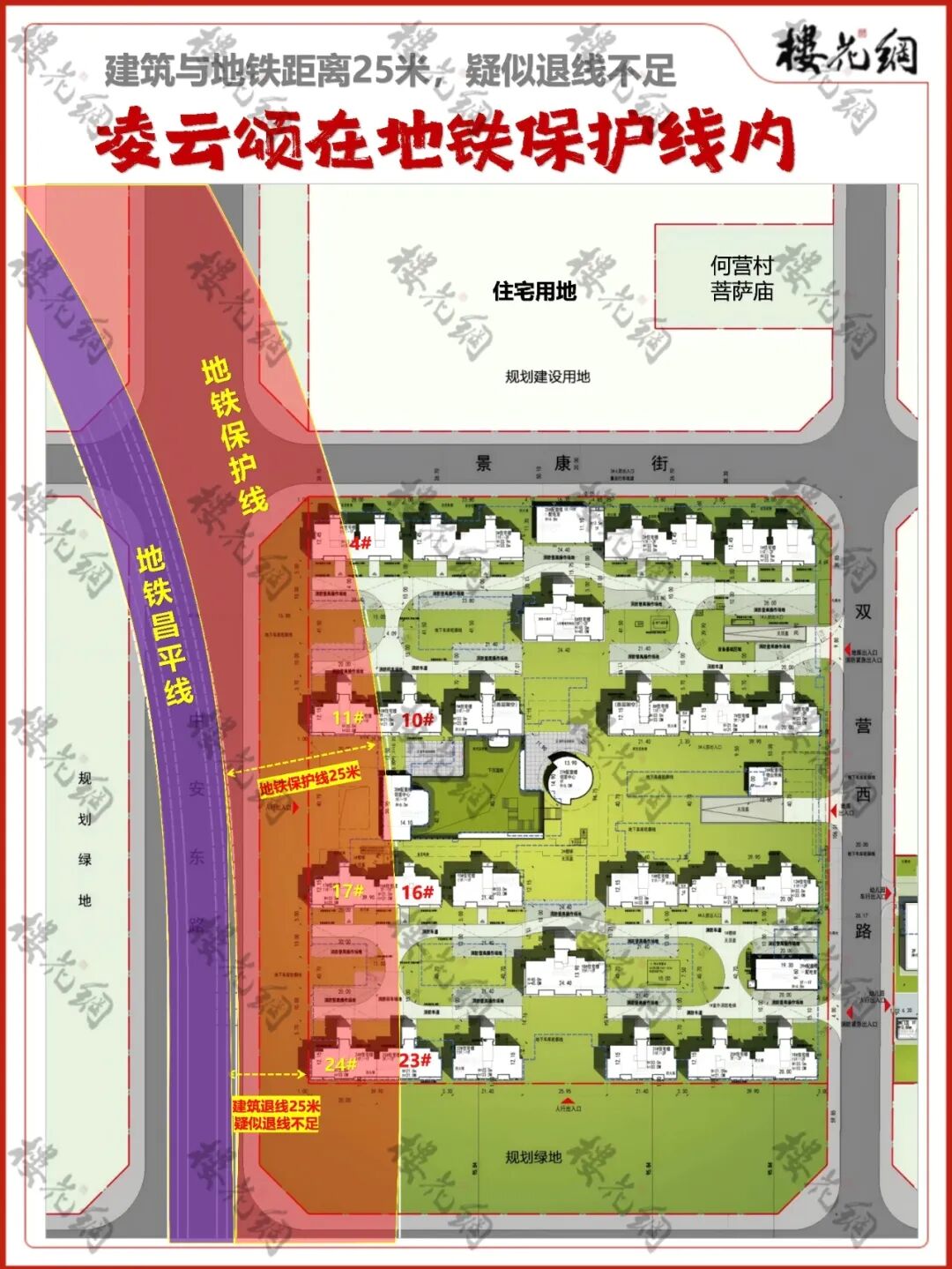 这意味着,凌云颂的4#、10#、11#、16#、17#、23#和23#都在地铁保护线以内。