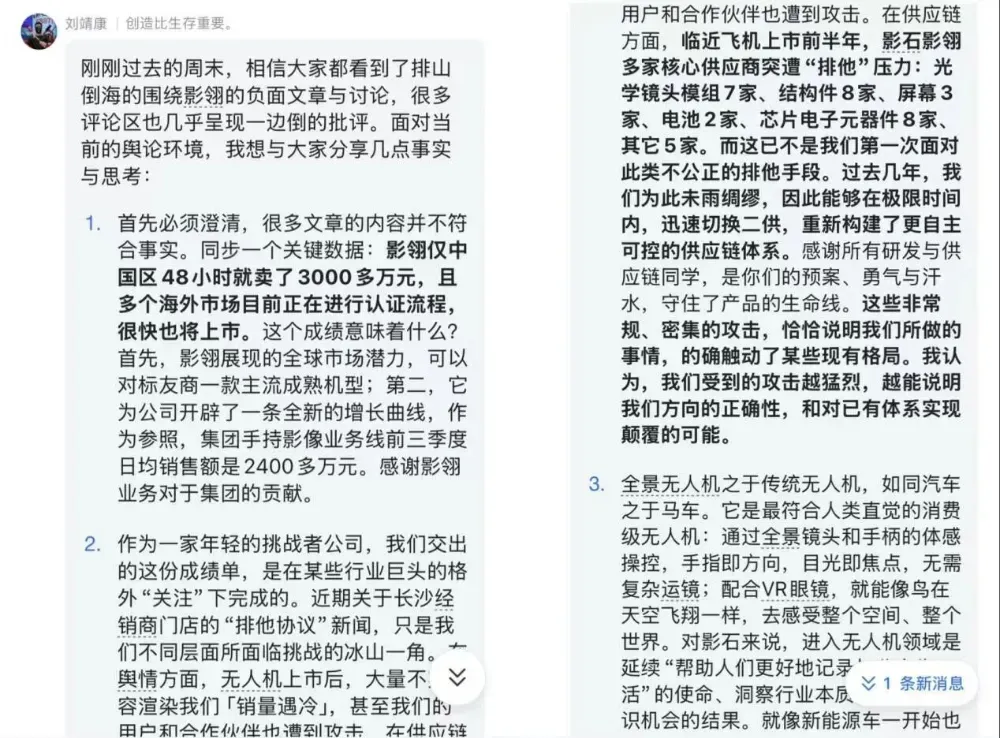 如今,从刘靖康近期发布的内部信以及影石官方声明来看,影石与无人机行业“老霸主”大疆之间的竞争已不再局限于暗流涌动,而是近乎公开化了。