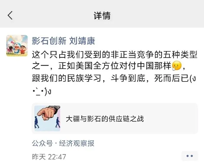 值得注意的是,刘靖康本人还在朋友圈转发该文,并评论称:“这个只占我们受到的非正当竞争的五种类型之一”,此举无疑进一步印证了两家公司竞争的白热化程度。