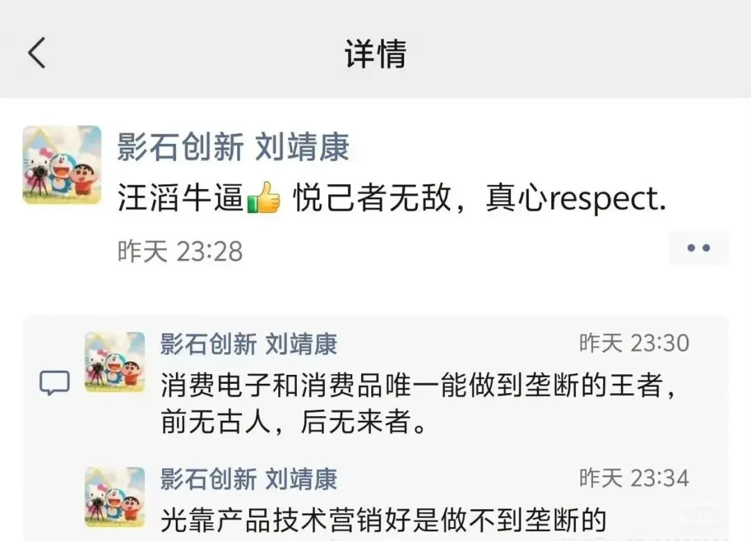 就在久谦咨询发布那份报告当天,影石创始人刘靖康在朋友圈公开致敬大疆董事长,并盛赞大疆是“消费电子与消费品领域唯一实现垄断的王者,前无古人,后无来者”。他还意味深长地补充道:“仅靠产品、技术和营销出色,是无法达成这种垄断地位的。”