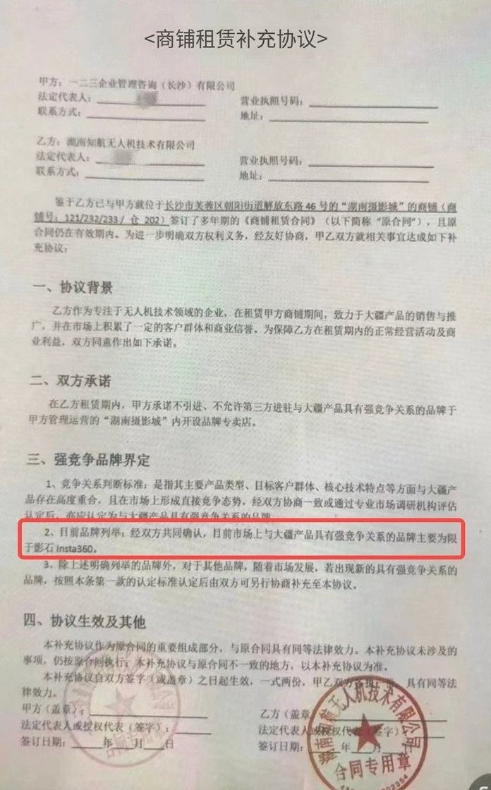 而在11月19日,长沙摄影城一家影石授权经销门店门头突遭拆除,经销商张均强提供的一份《商铺租赁补充协议》显示,商场管理方一二三企业管理咨询(长沙)有限公司曾作出明确承诺:在大疆授权经销商湖南知航无人机技术有限公司的门店租赁期内,不得在“湖南摄影城”内引进或允许任何第三方,开设与大疆产品存在直接竞争关系的品牌专卖店。