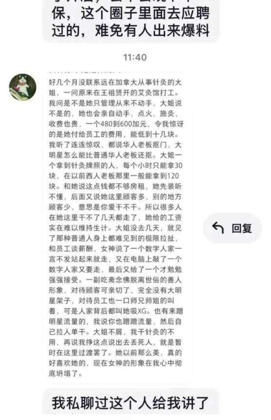 根据网上流出的对话截图来看,一名网友称他大姐是王祖贤艾灸馆员工,虽然赞其店里会亲力亲为,但却在薪资上刻薄员工。