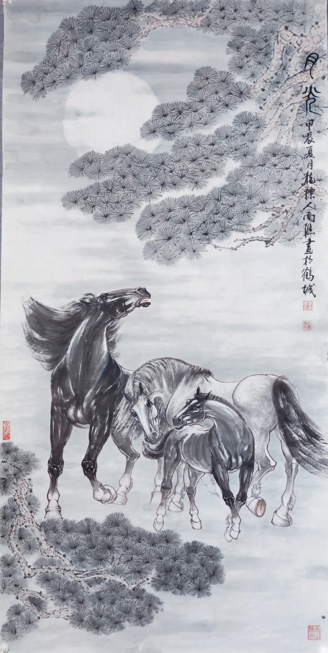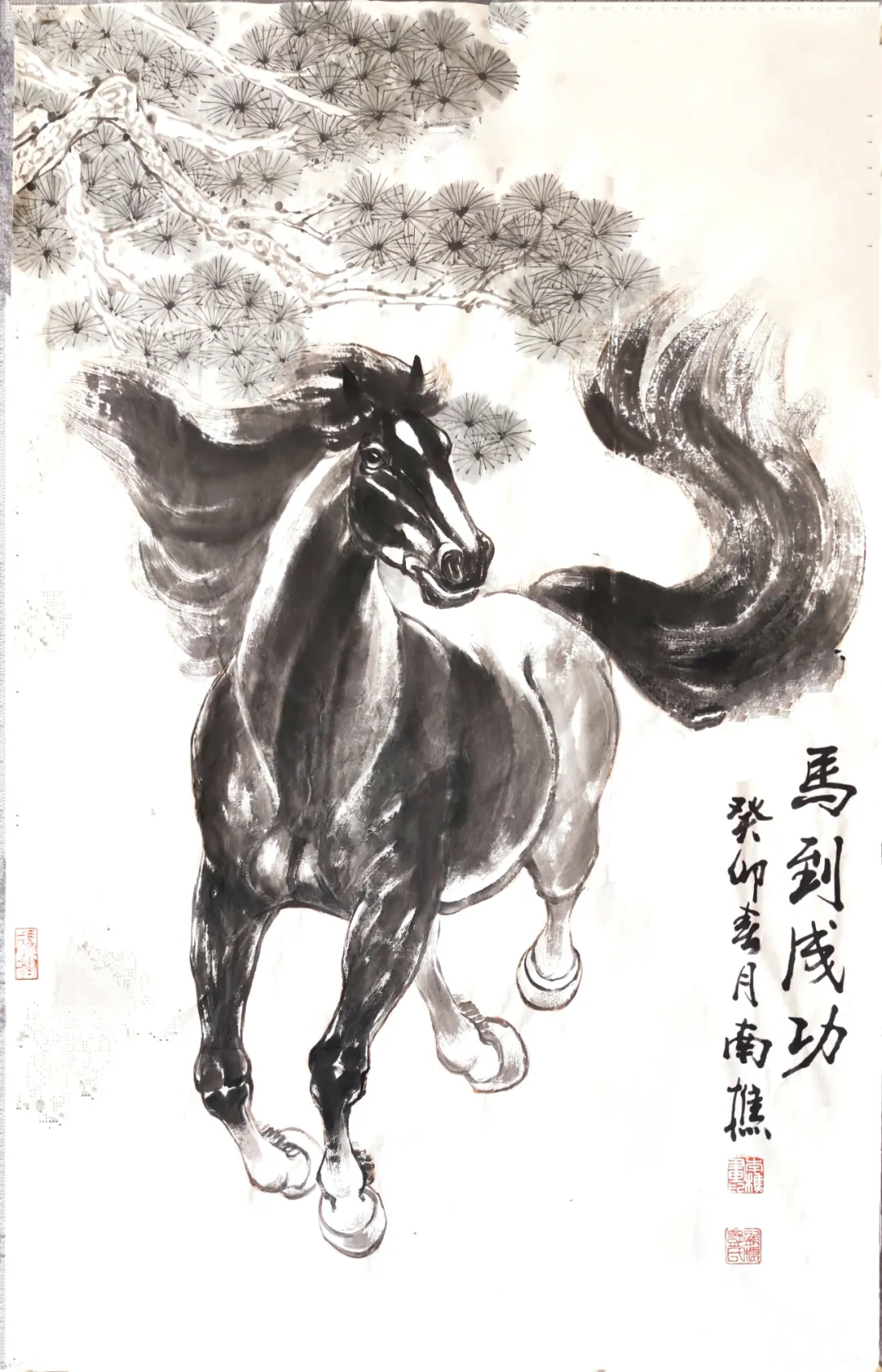 邓南樵创新地将写意的豪放洒脱与工笔的细腻严谨相融合,勾勒出骏马的筋骨血肉;同时巧妙地贯通中西艺术之长,既传承了传统水墨的笔墨意韵,又融入现代艺术的表现手法与审美观念。在他的画作中,墨色浓淡相宜,线条刚柔并济,既有传统画中“以形写神”的笔意,又充满鲜明的时代气息。每一幅作品,都是他艺术探索与创新的见证,也正是这种独特的艺术风格,让他在众多画家中脱颖而出,赢得国内外奖项与无数藏家的青睐,更在画马艺术领域留下了浓墨重彩的一笔。