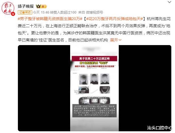 今天,热搜内容:#男子整牙被韩籍无资质医生骗20万# #花20万整牙两月反弹成地包天#引起了网友热议。