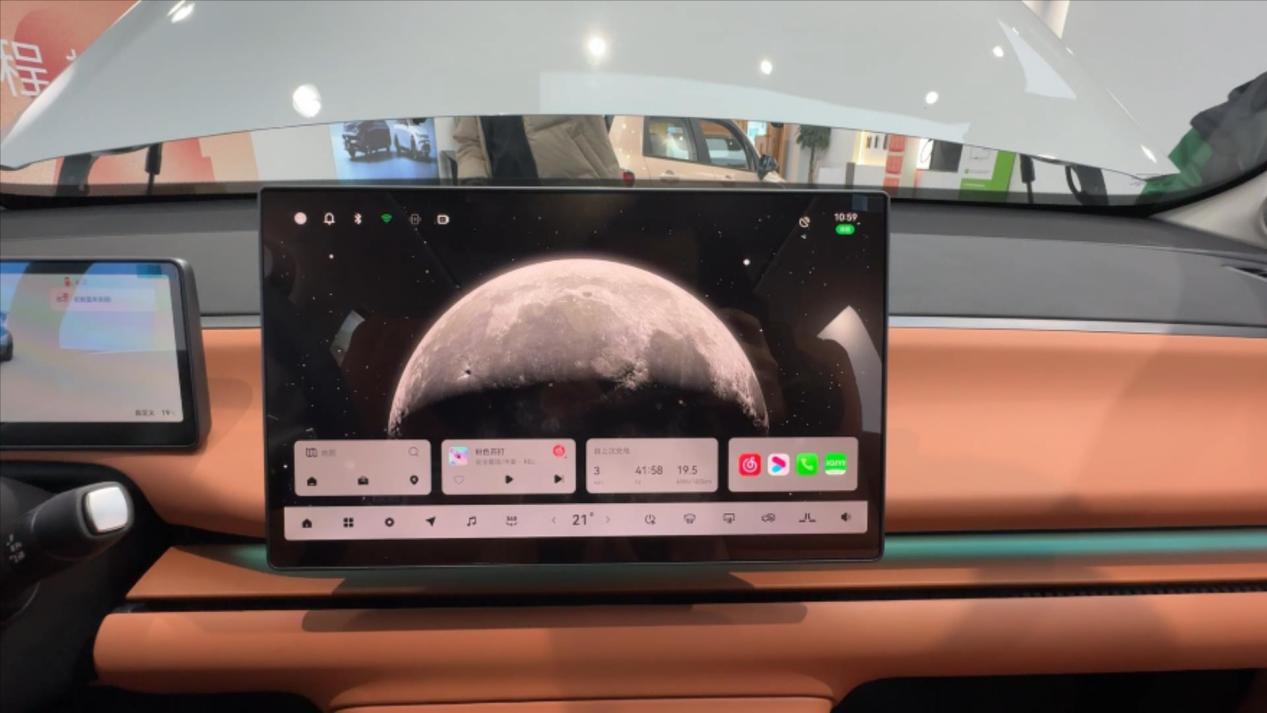内饰的设计同样清爽,中控台上只有两块屏幕和方向盘,多余的元素都没有。看起来虽然简单,但内核有点东西。就比如中控大屏,尺寸为14.6英寸,内置了骁龙8295芯片,搭载基于安卓系统开发的LEAP OS。