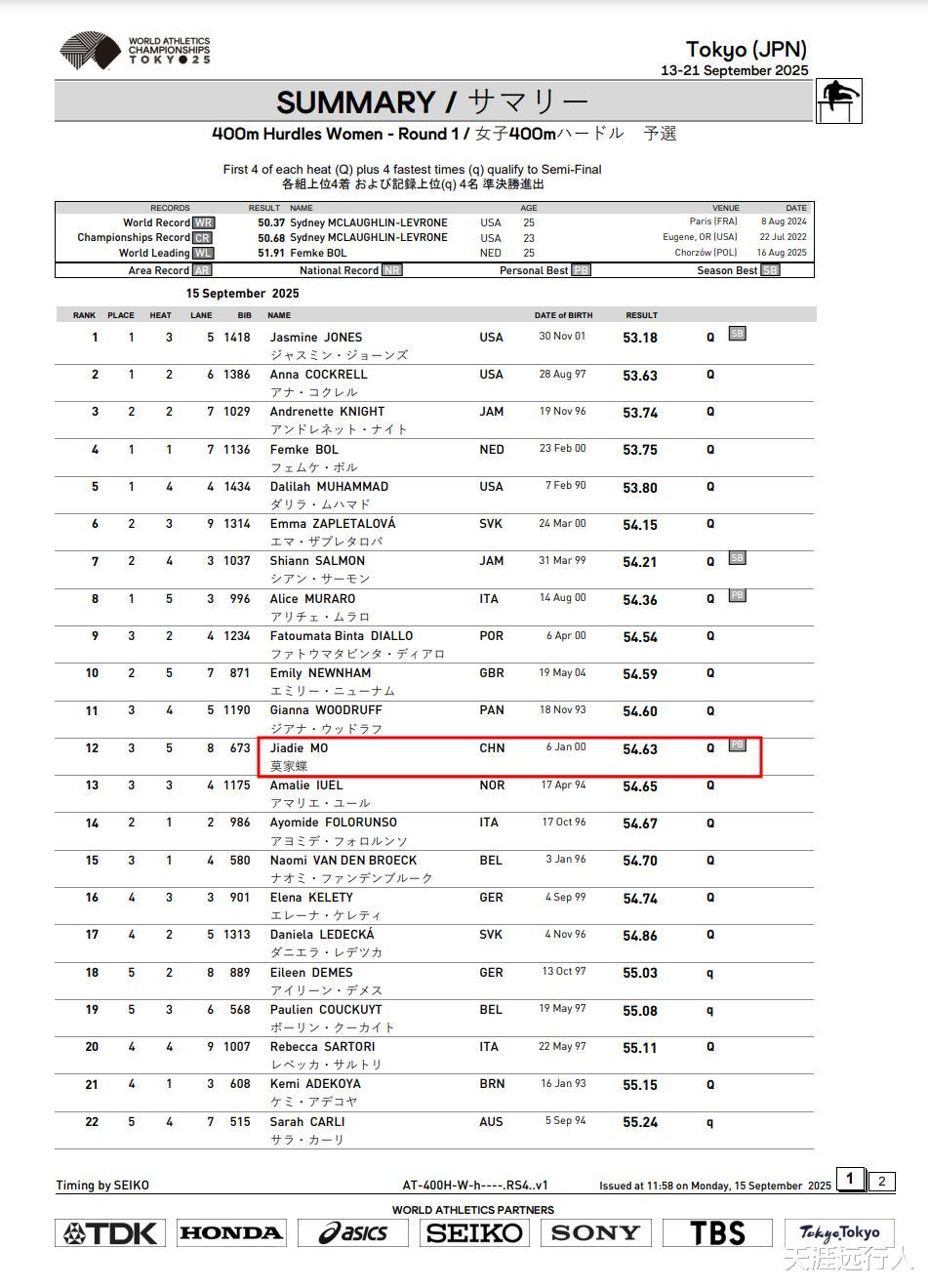 莫家蝶跑出54秒63的个人最好成绩,小组第三直接晋级半决赛,中国女子400米栏时隔16年再次冲进世锦赛半决赛,暂居亚洲选手的第一位,9月17号就比半决赛,一起给她加油,期待再创佳绩!