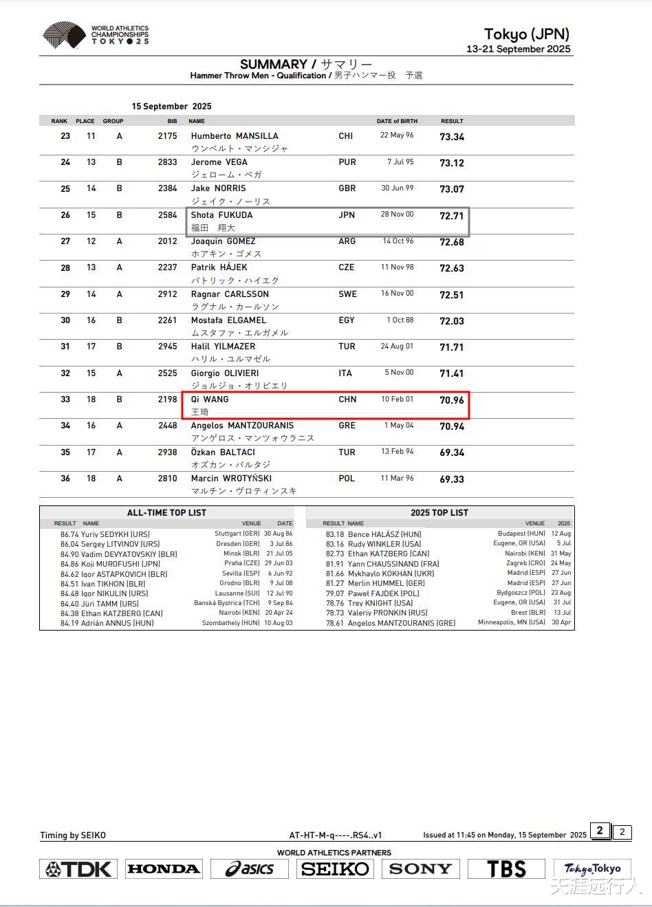 王琦投出70.96米的成绩,总成绩排在第33位,黯然出局。