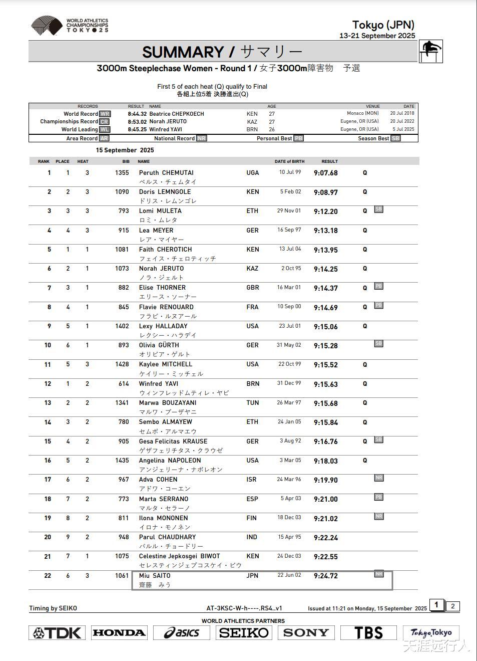 非洲选手的天下,乌干达、肯尼亚、埃塞俄比亚选手分列预赛前三。