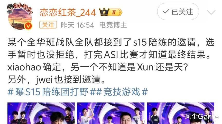 WBG邀请赛打进淘汰赛之后,爆料博主红茶发文透露:全华班全队都收到了,S15世界赛陪练的邀请,选手们没有拒绝,但最终结果,得打完邀请赛才知道,虽然没有点名WBG,但红茶的配图,是参加邀请赛的三支队伍,这三队里,只有WBG是全华班,所以小虎可能也要去参加陪练。