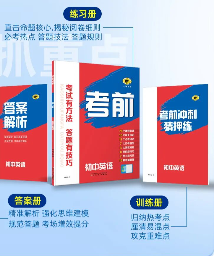 很多孩子书包里塞满了练习册、试卷、答案书,不仅浪费时间,还容易混乱。《初中考前》独创“三位一体”结构,一套书解决所有备考需求: