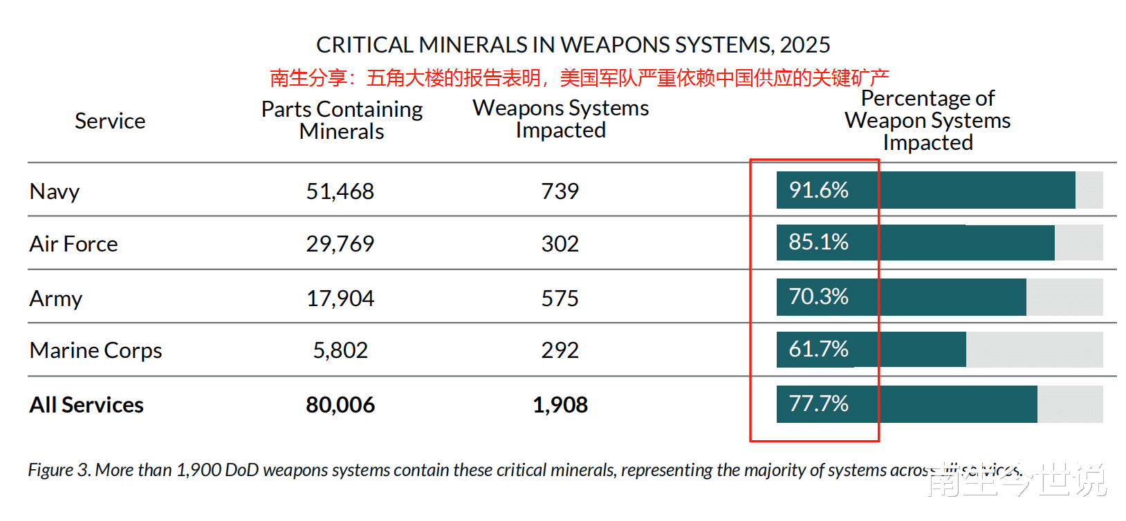 不久前,美国战争部公布了一项调查,显示:美国海军对中国提供的关键矿物依赖度高达91.6%,空军依赖度为85.1%,陆军依赖度为70.3%,海军陆战队依赖度为61.7%——各军种平均后,整体依赖度是77.7%。