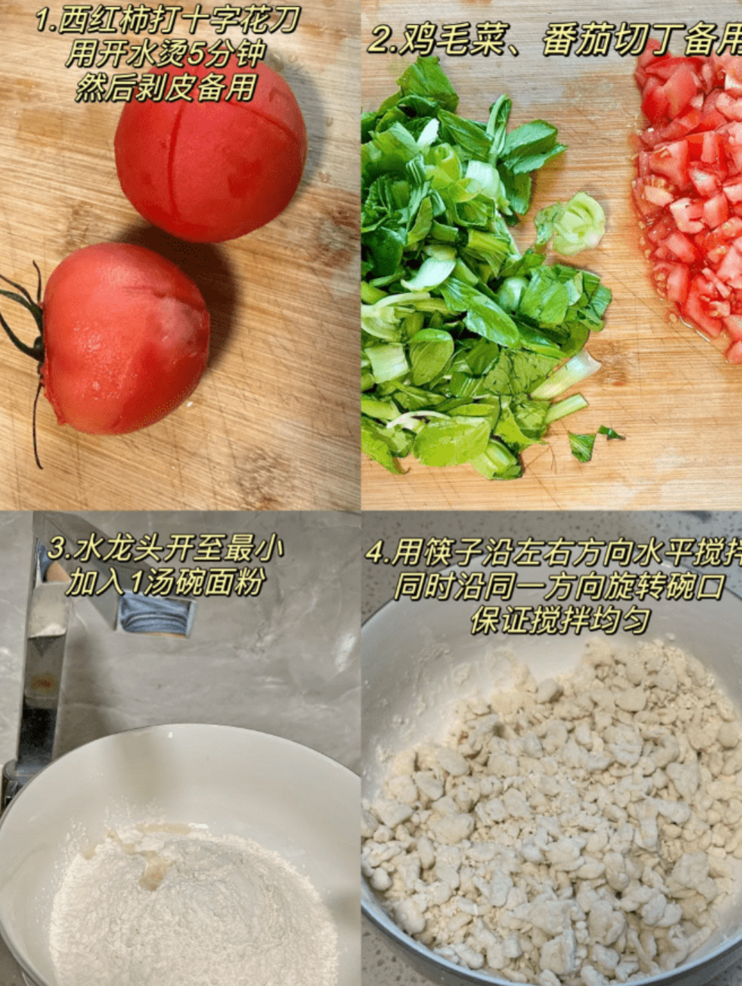 接下来,就是见证奇迹的时刻——制作过程。首先处理西红柿,在它身上打十字花刀,然后用开水烫个5分钟,就像给西红柿做了一场舒适的温泉浴,之后就能轻松剥皮啦。把剥好皮的西红柿切成丁,鸡毛菜也切成小段备用。