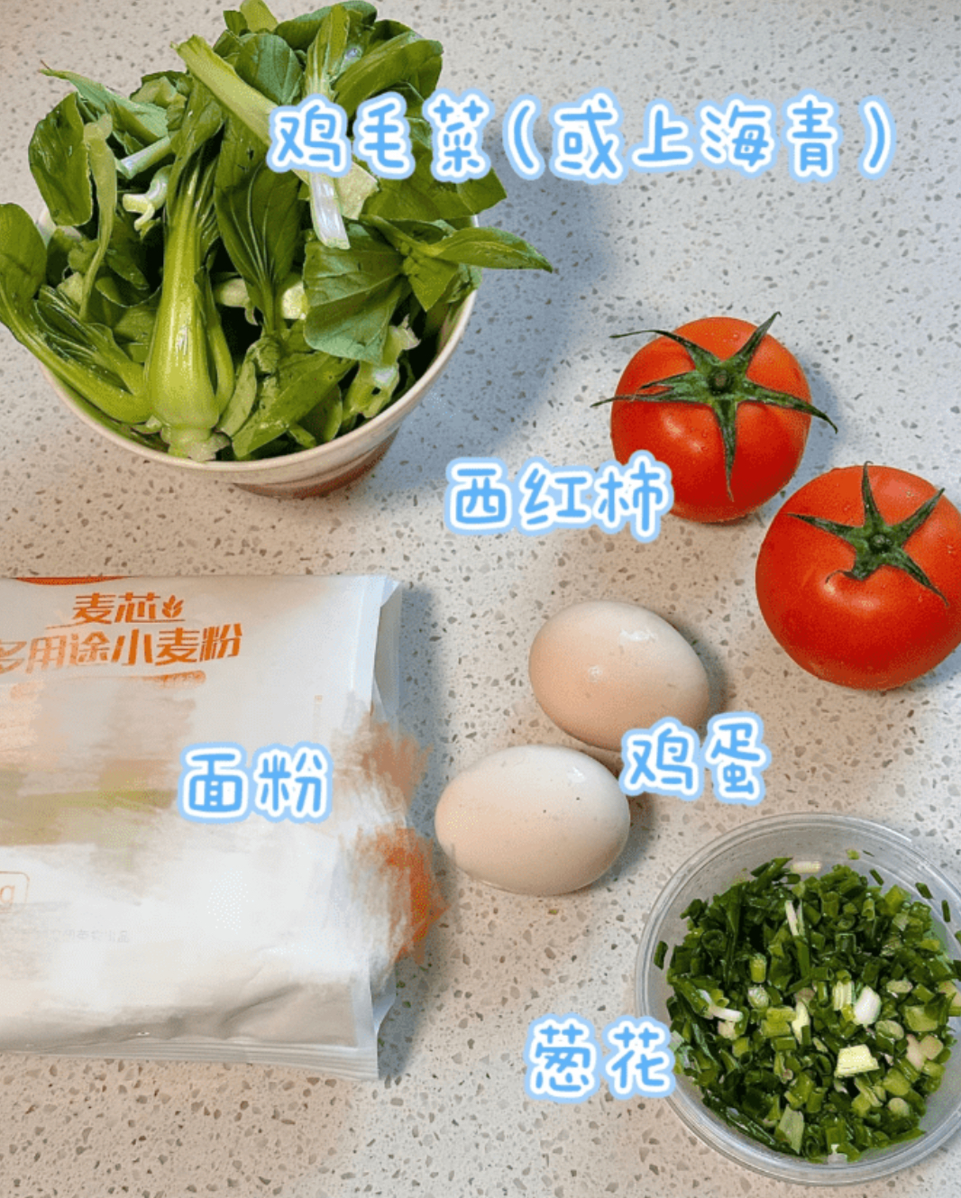 做这道疙瘩汤,食材那是相当简单。两个红彤彤的西红柿,就像两个小灯笼,给这道汤增添了鲜艳的色彩。再准备一把鲜嫩的鸡毛菜,几根翠绿的葱,还有适量的面粉和两个鸡蛋。这些食材在菜市场随便逛逛就能轻松搞定。