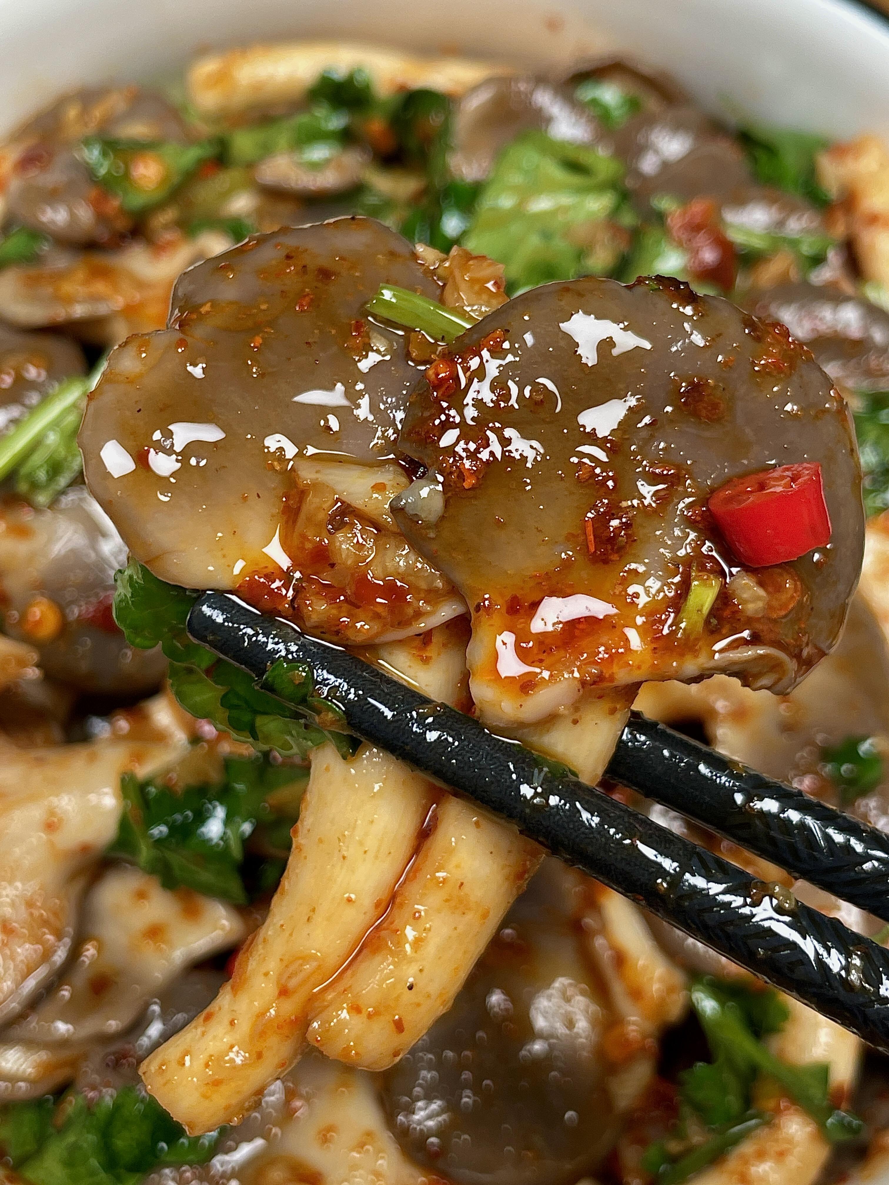 这道菜的灵魂,藏在食材的预处理里。新鲜的平菇要选菌盖肥厚、边缘内卷的,颜色呈自然的灰白色,闻起来有淡淡的菌香。买回家后,千万别用刀切——顺着菌褶的纹理,用手撕成小朵,断面粗糙的平菇更容易吸附酱汁,口感也更有嚼劲。撕好的平菇放入淡盐水中浸泡十分钟,轻轻搅动后捞出,用流动的清水冲洗两遍,沥干水分。这里有个关键步骤:将平菇铺在厨房纸上,轻轻按压吸走表面水珠,或者用手攥干多余水分。水分太多,炒的时候容易变成“水煮菇”,失去爆炒该有的焦香。