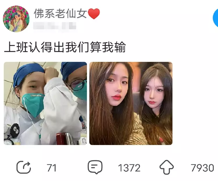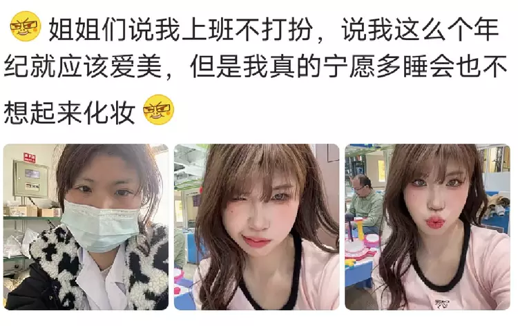 因为有些工作是不允许化浓妆的,比如有一位女生在当实习护士,就晒出了自己上下班的区别,表示自己的容貌差别之大,能让人认出来,就算她输。
