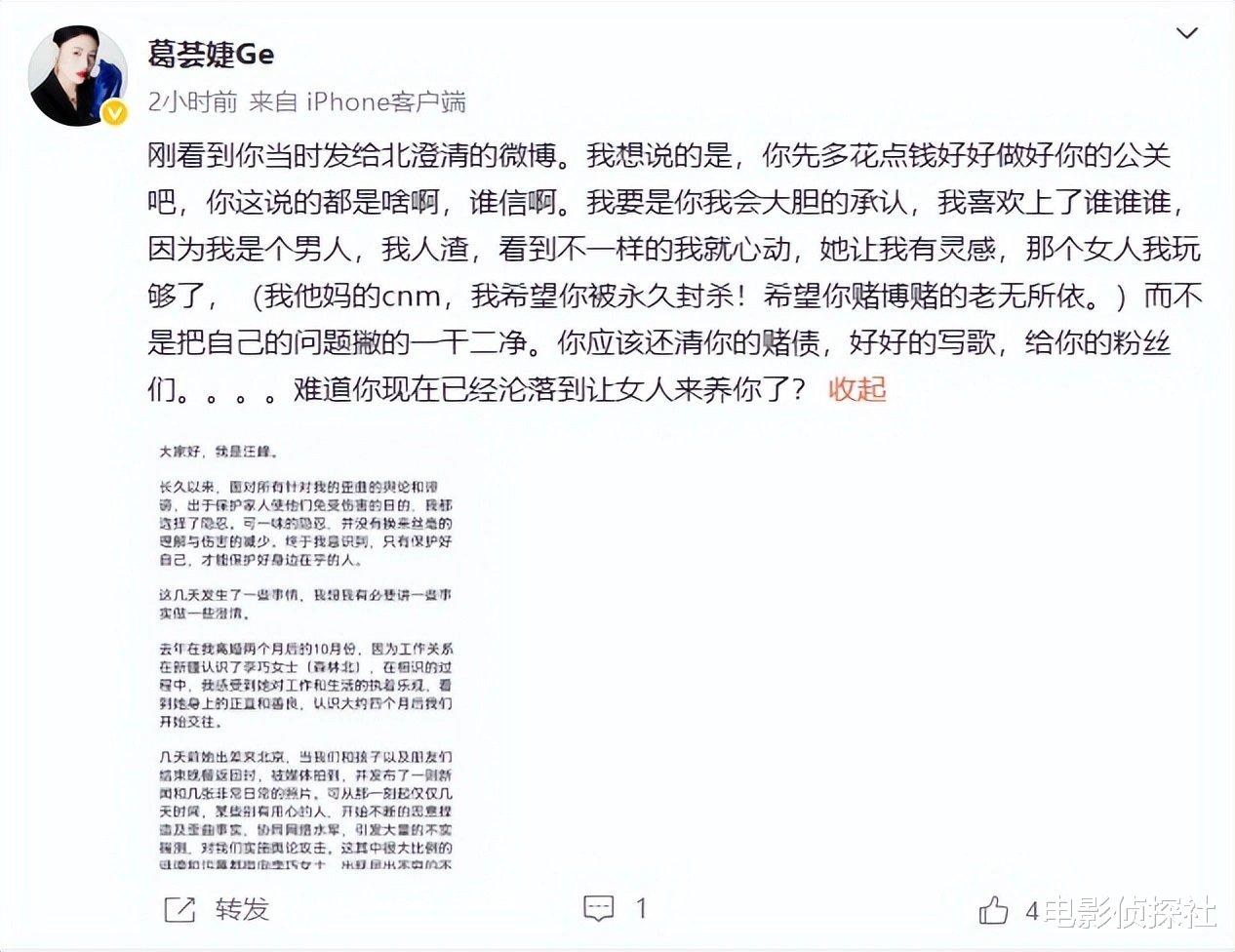 更让人惊讶的是,葛荟婕在文中还爆料称汪峰赌博,还欠下赌债,希望汪峰被永久封杀,赌博赌的老无所依。