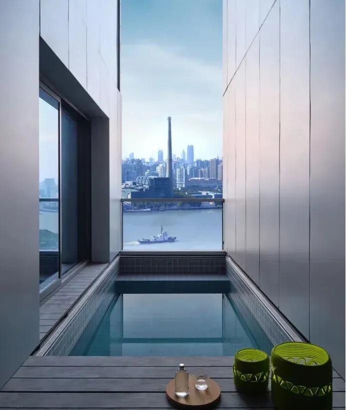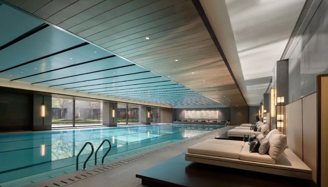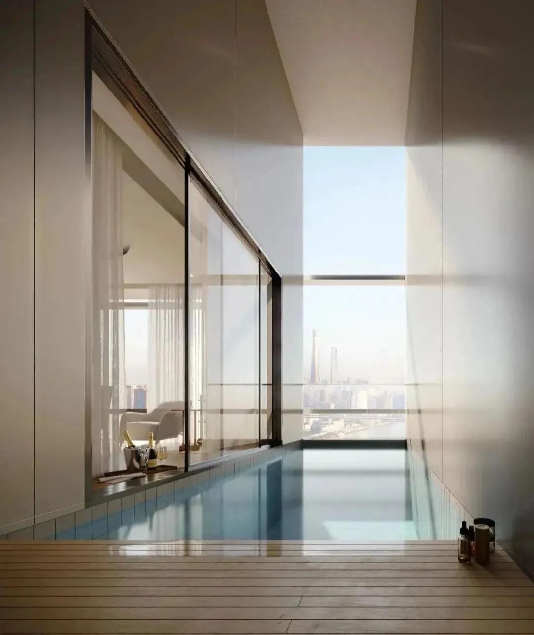 位于高层的中庭被重新定义为泳池空间,赋予公共区域新的功能属性。木质甲板围合水体,提供触感与视觉的双重体验;玻璃护栏在保障安全的同时维持通透性,使空间保持开放与秩序的统一。