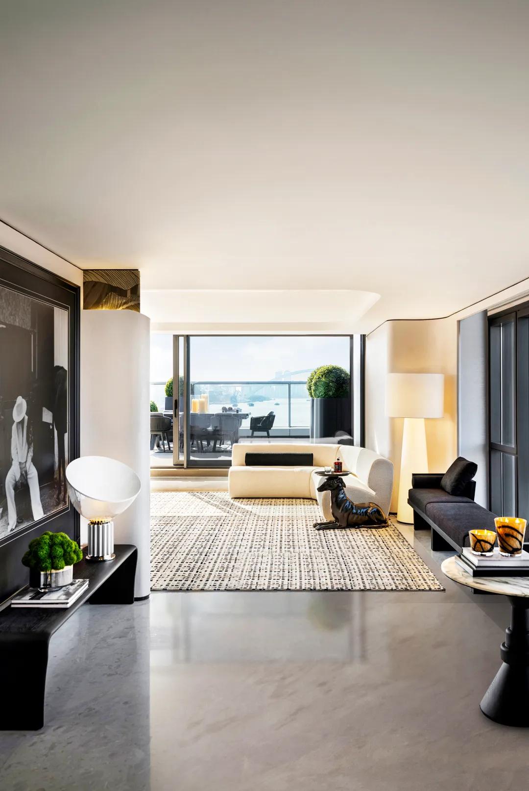 作为一线江景住宅,该建筑在形象与内部体验之间形成对比关系。外立面以现代主义构图为主导,呈现冷静克制的视觉特征;室内则通过引入自然景观,建立与环境的连续性。绿植层层展开,在动线组织中承担引导作用,使空间逐步过渡至更加内向的居住状态。