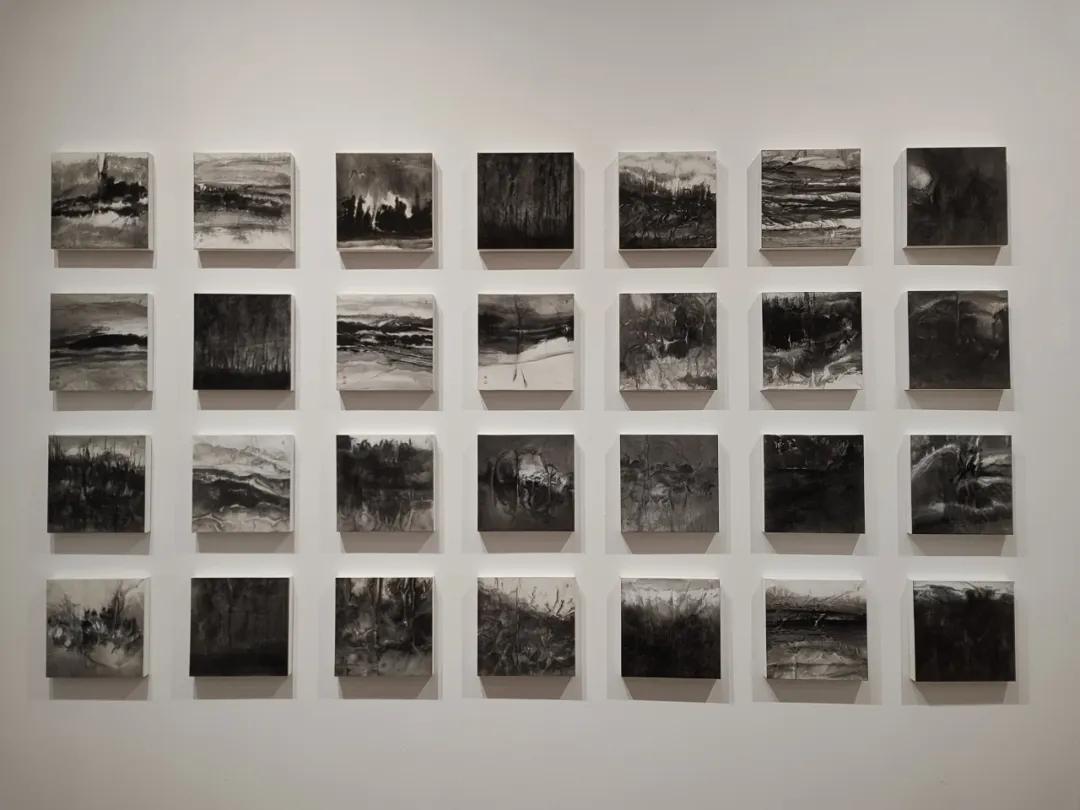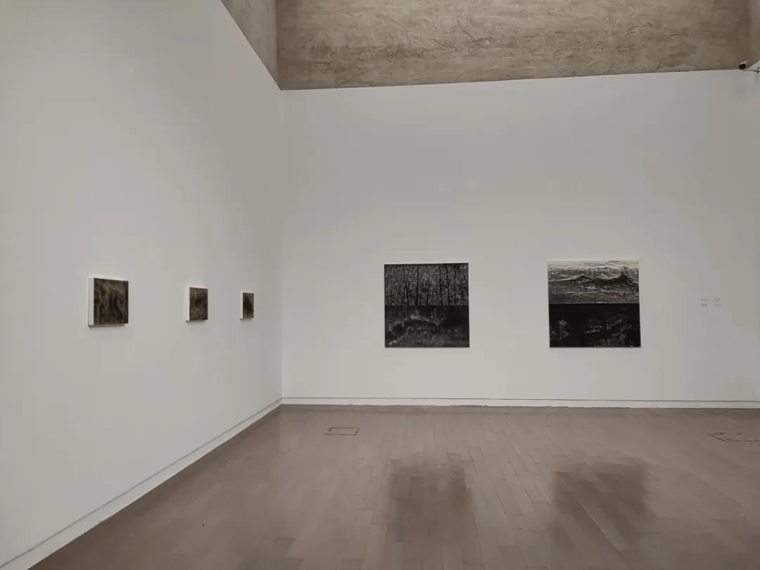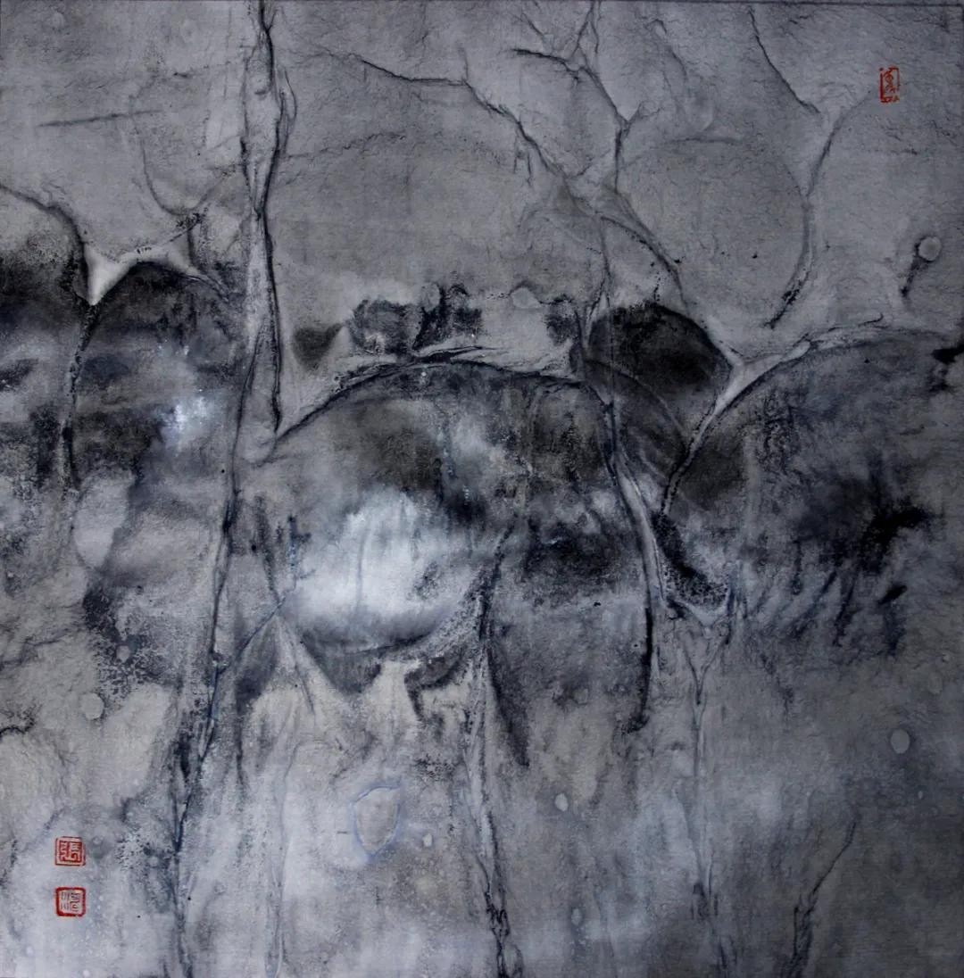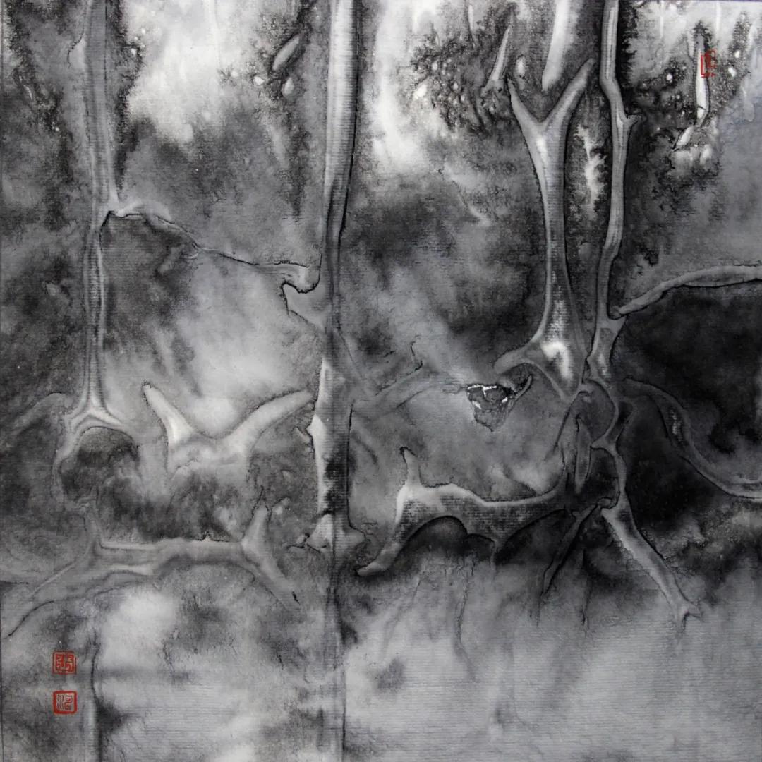 其次,张涛的绘画语言是纯粹的,具有随机性和偶发性。他使用多种材料不局限水墨,还有丙烯、矿物质颜料等,绘画上使用传统的笔法皴、擦、结合滴洒 水渍、沙石、拓印等现代手法,创作出不同质感和异样视觉。在有意和偶得之间自省和解放。因此他的作品有具象的画面,也有意会的画面,还有抽象的形。同时,画面抽象、流动、虚实相生,即保留中国传统画的意境与留白,讲究气韵生动,然而又不同于中国画的图式,更多呈现的是“山之所以为山的”精神世界。