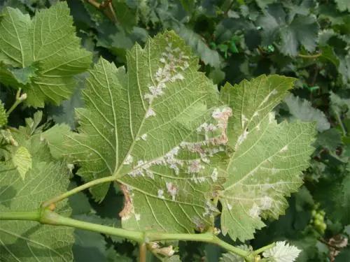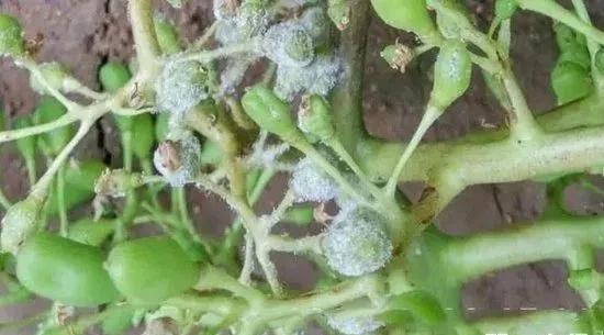 受害后期的枝蔓、叶片上产生淡褐色凹陷病斑,果梗变黑,长出黑色菌核。霜霉病为害叶片,正面产生浅黄色水渍状病斑,背面生有灰白霜霉物(即病菌孢子),严重时病斑扩展整张叶片,使叶片呈黄褐色至叶片脱落;穗部受害,果梗、果粒均布满白色霜霉病菌,果梗变褐坏死,果粒肩部变褐凹陷至脱落。此时受害,葡萄产量损失最重。