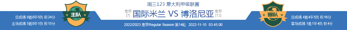 国际米兰上一轮联赛在客场0-2完败尤文图斯,输掉了国家德比的关键战役,近期各项赛事已经是遭遇两连败,目前在积分榜上他们已经跌到了第七的位置,争冠的希望已经变得十分渺茫了。球队近期内部问题确实不少,首当其冲的便是伤病,主力前锋卢卡库在伤愈复出后仅仅踢了两场比赛就再次受伤,为了确保能够赶上世界杯,这场比赛大概率还是不会出现在大名单之中。而按照国米近期在硬仗中的表现来看,以劳塔罗和哲科、科雷亚组成的锋线明显已经显露出了疲态,这场比赛面对博洛尼亚的来访未必会有很强的冲击力。