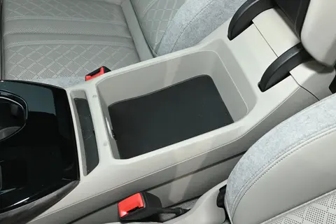 储物能力很实用,中央扶手箱是分层设计,上层有两个带限位器的杯架,放矿泉水瓶不会晃,旁边还有个小储物格能放钥匙、手机。下层空间有隔断,分放一些小物件;门板上的储物格能放下一瓶矿泉水和一把雨伞,前排座椅后面有弹性储物袋,能装平板电脑和杂志,日常用品都有地方放。