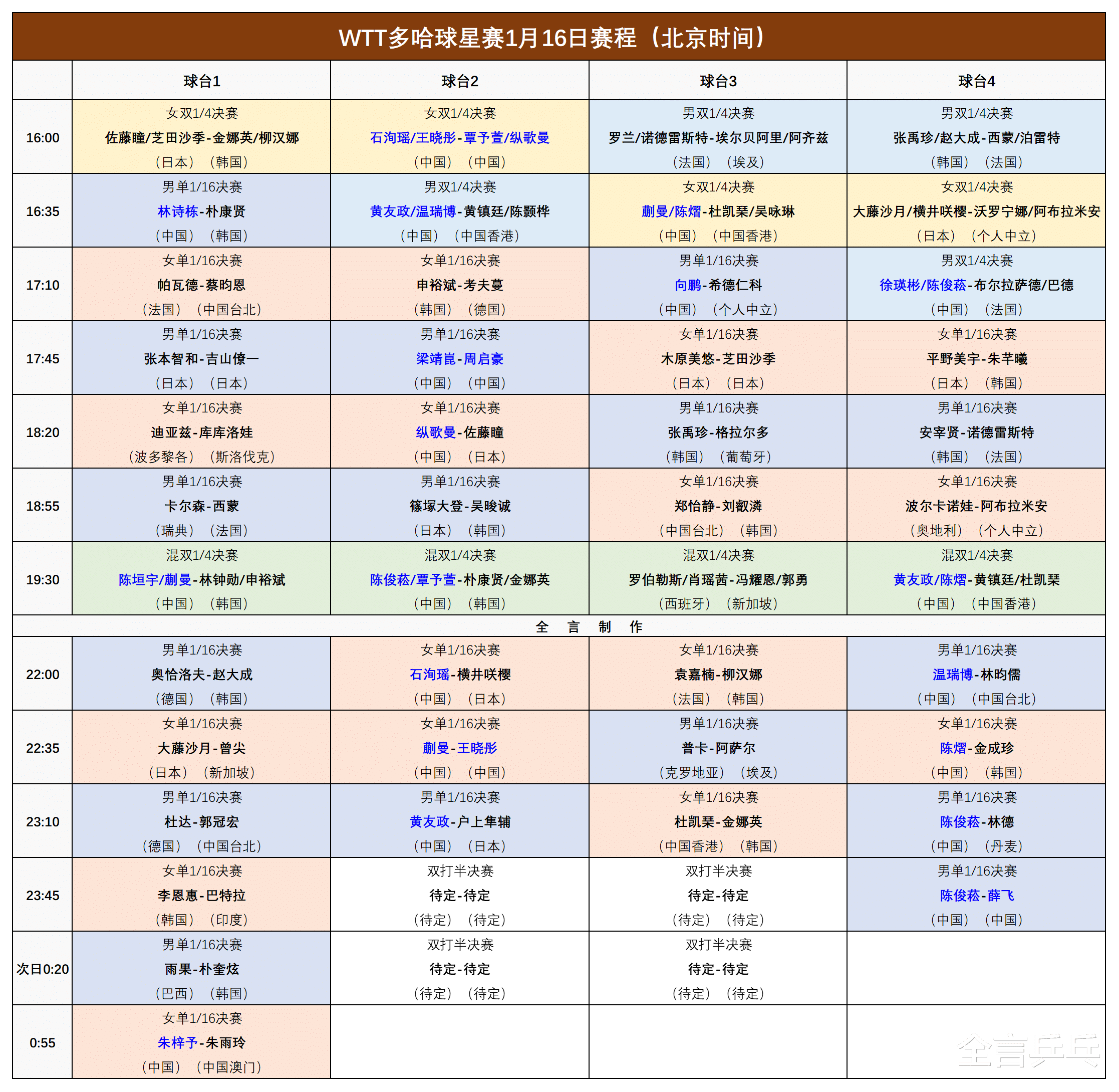 接下来国乒将在当地时间1月16日(北京时间持续至17日凌晨)迎来至少19场比赛,其中4场内战15场外战,对决林昀儒、朱雨玲等一线高手,冲击男女单打16强、双打4强与决赛席位,此外混双也会诞生4强,竞争开始逐渐白热化,北京时间的最新赛程如下: